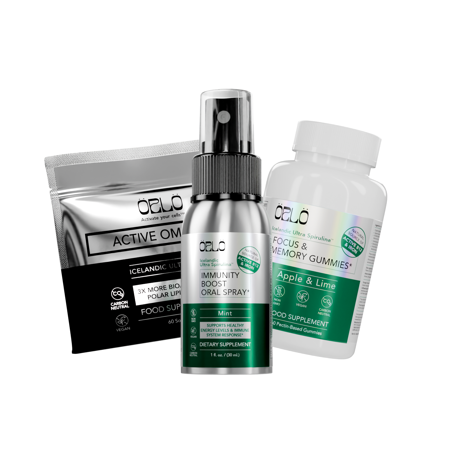 Support your body and mind with a trio designed for healthy aging. Sustain heart, brain, and joint health with our clean-sourced Omega-3. Stay sharp with Green Apple & Lime Memory Gummies featuring PS Sharp® and Active B12. Strengthen immunity and energy with our refreshing Mint Immunity Spray powered by Icelandic Ultra Spirulina™. Science-backed, delicious, and built for long-term vitality.